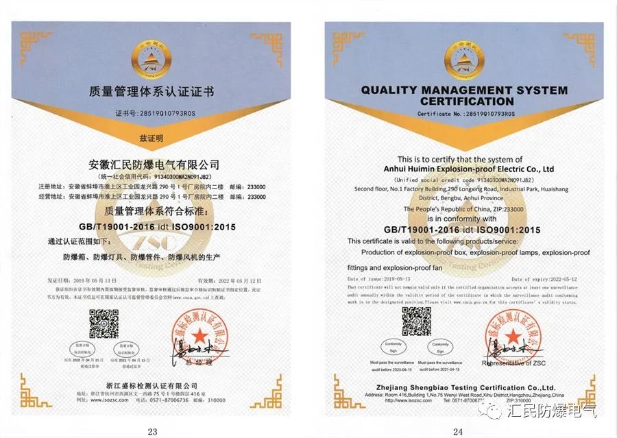 防爆合格證,3C強制產品認證證書,ISO9001質量管理體系認證證書。